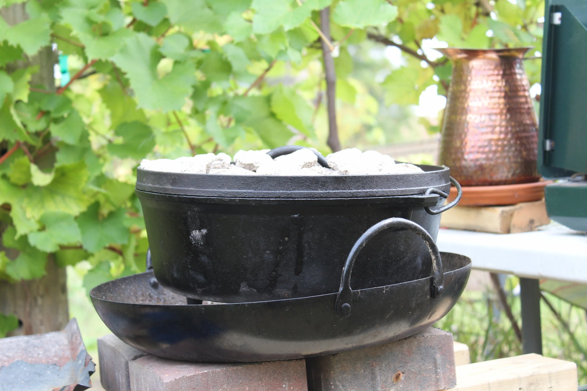 My 12 qt. Dutch oven will take 15 coals on the top, and 10-12 coals on the bottom to obtain 350 degrees.